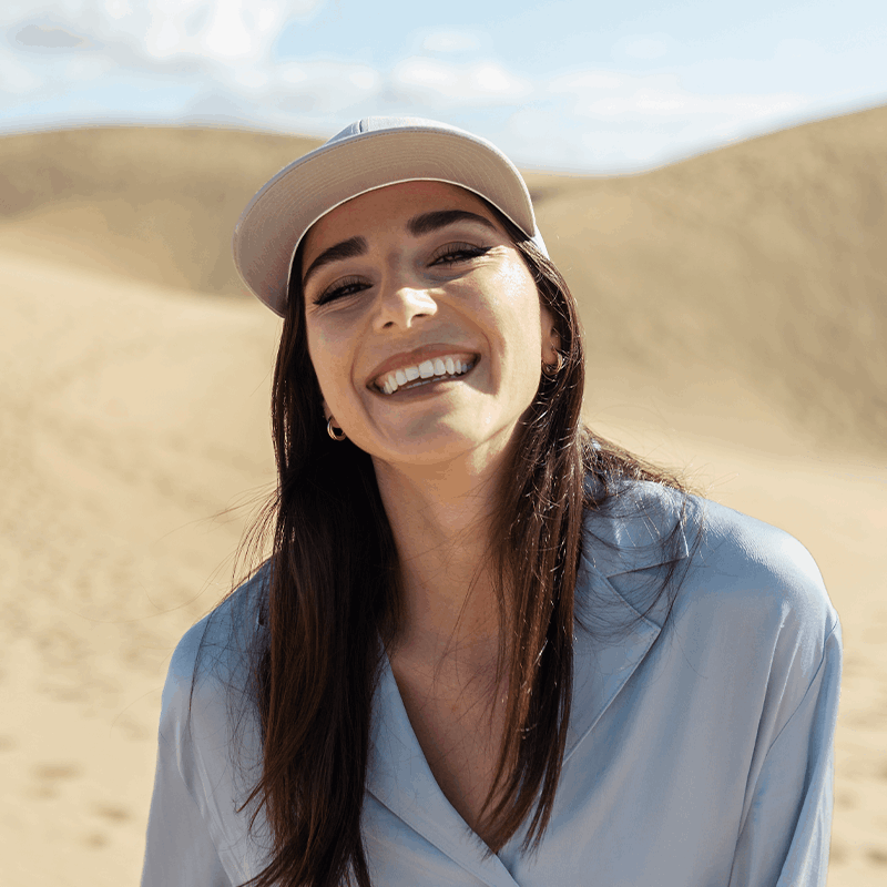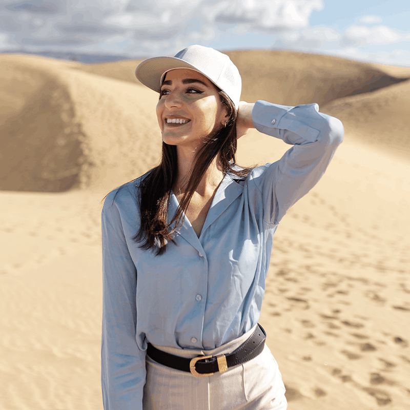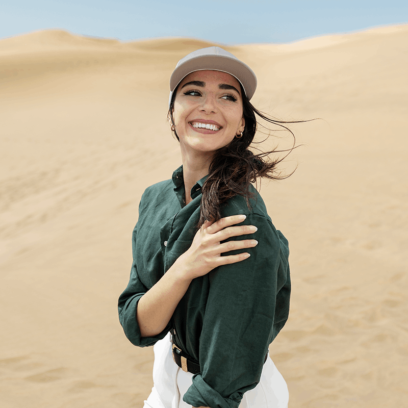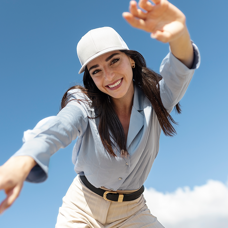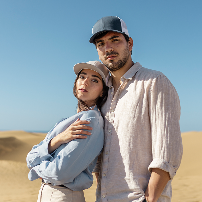 Frente flexível (peça única), aba curva revestida de tecido e com 8 costuras, revestimento de tecido na copa (laterais e traseira) e fecho fitão tecido.