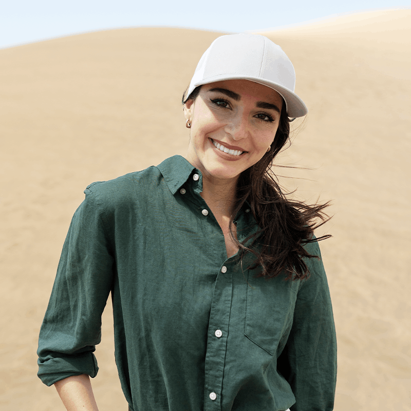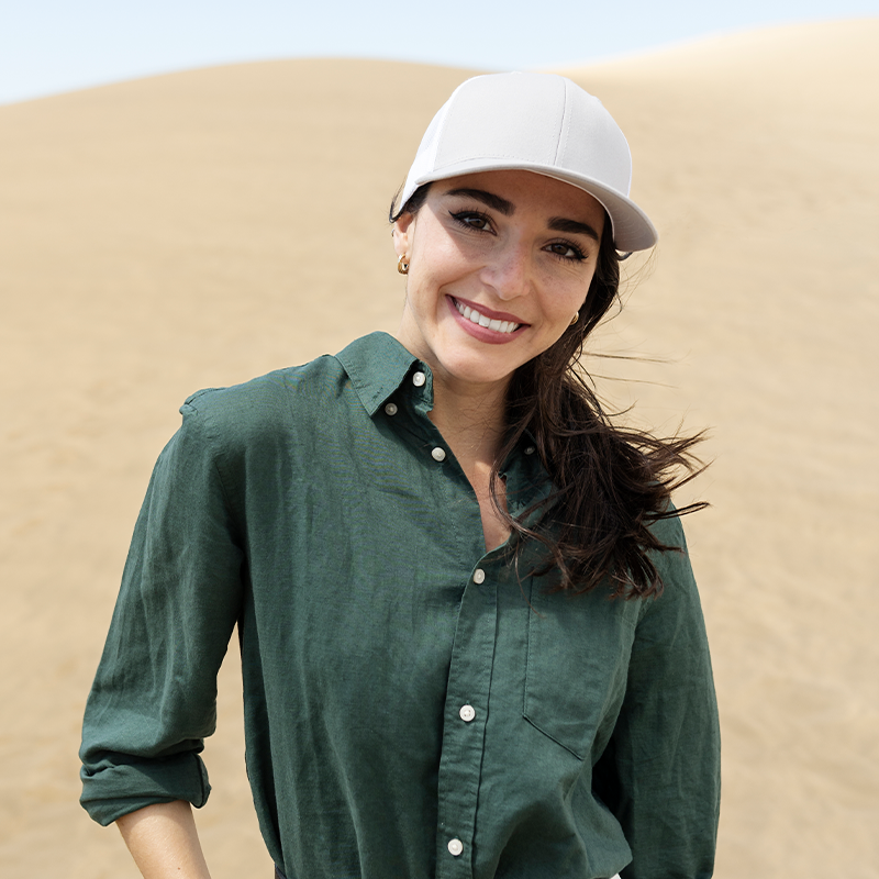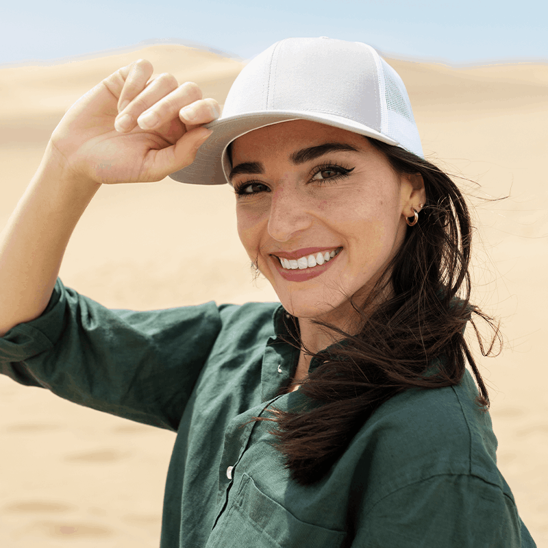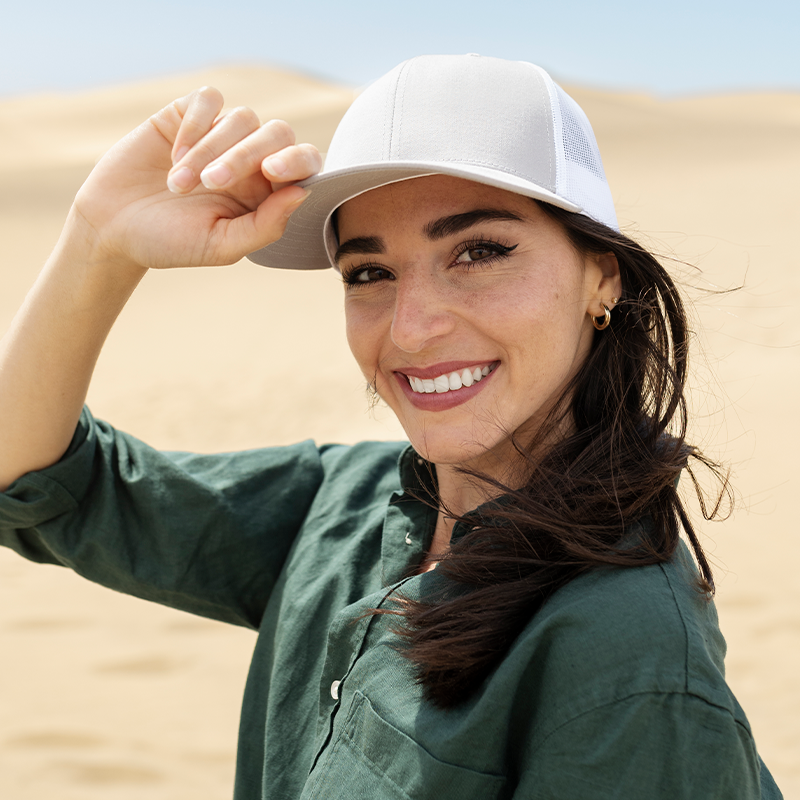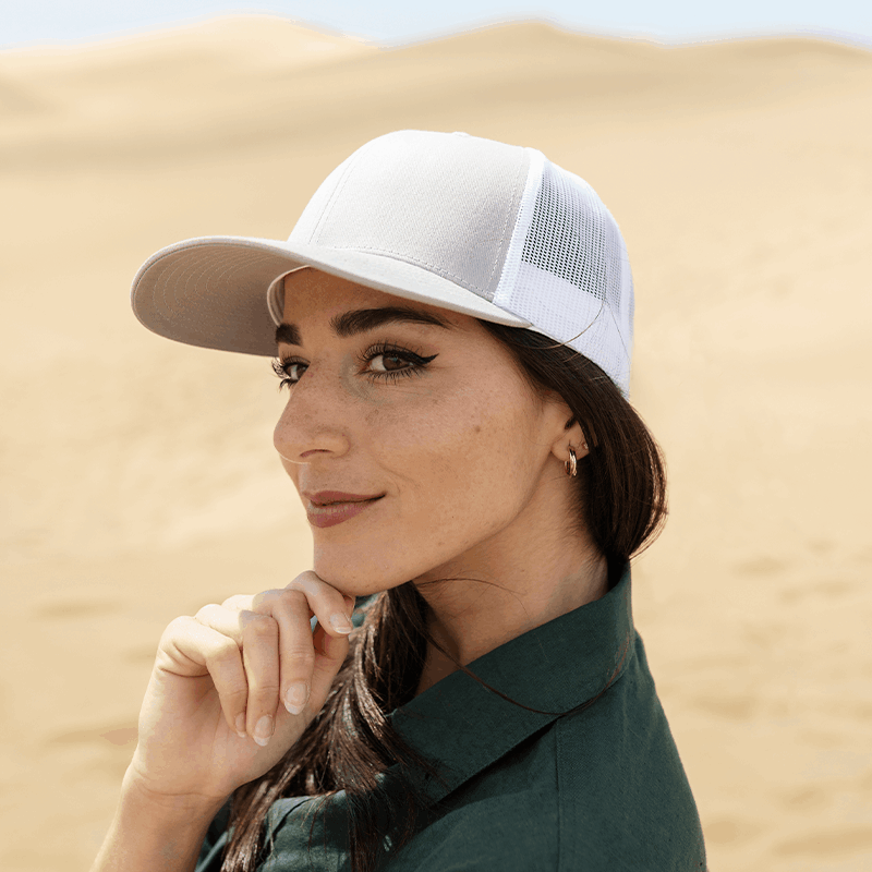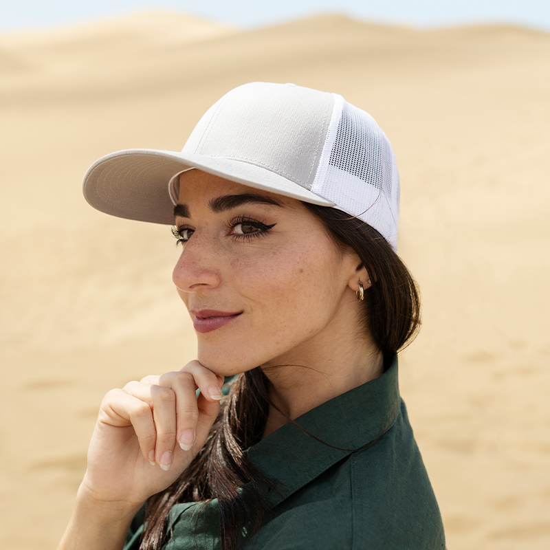 Frente firme (peça única), aba curva revestida de tecido e com 5 costuras, tela de poliéster na copa (laterais e traseira) e fecho plástico ajustável.